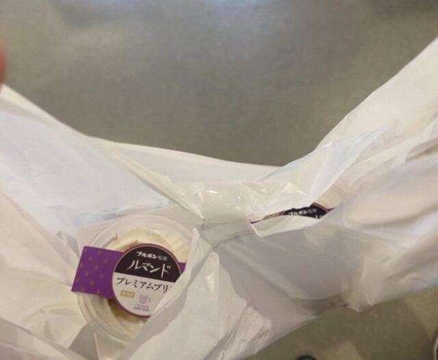 会計時にレジにいる店員さんにこの紙を渡すと、持ち帰りのルマンドプレミアムプリンをレジ袋に入れて渡してくれます。
