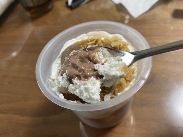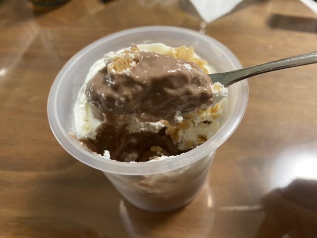 カラメルソースがなくてもいいんじゃないかと一瞬思いましたが、この強めの甘みがあるからこそ、ココアプリンとホイップクリームのやわらかな甘みとうまみが引き立っています。