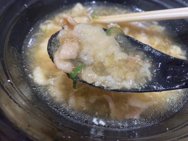 出汁は鯖・昆布・椎茸などからとった甘めの出汁だそうですが、甘みやまろやかさより塩味が前面に出ているので薄味の塩スープといってもいいかもしれない。
