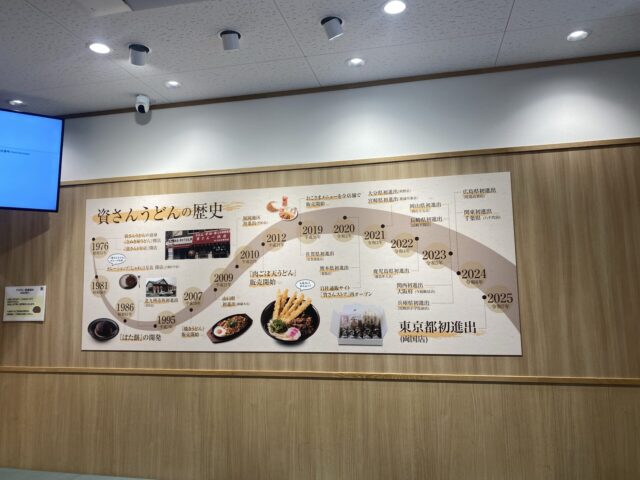 待機スペースには資さんうどんの歴史を知ることが出来ます。それは…
