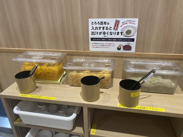 薬味はセルフサービスで、薬味コーナーには薬味が3種類、薬味用の取り皿が置いてあります。