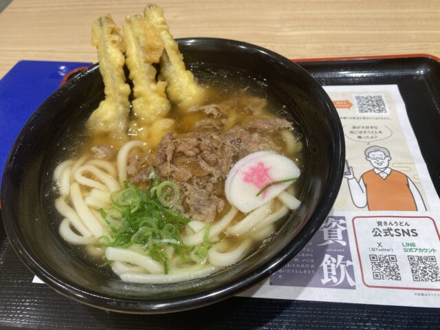 一緒に来た夫は肉ごぼ天(3本)を注文。肉ごぼ天は資さんうどんで人気ナンバーワンだそうです。