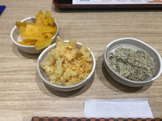 左から壺漬け(大根のお漬物)、天かす、とろろ昆布です。