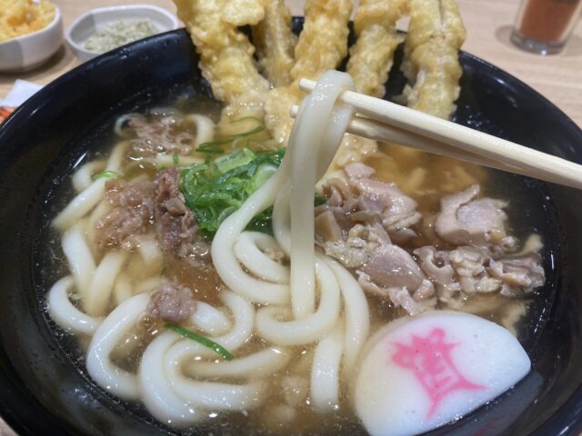 うどんは歯ごたえはやさしめの食感、もちもち感もしつこくない程度のやさしいもちもちさ。