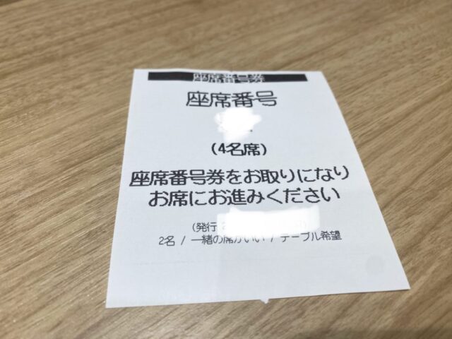 空席時は座席番号記載の券、混雑時は呼び出し番号記載の券が受付機から出てきます。