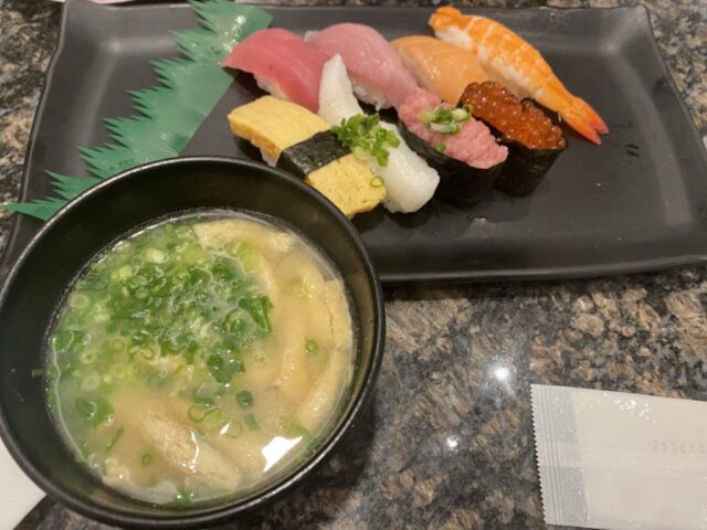 注文したお寿司が来る前にお味噌汁を取りに行ってもいいし、お寿司が来てから取りに行くのもよしですね。私は先に取りに行って、お寿司を食べる前にお味噌汁でお腹を温める派です。
