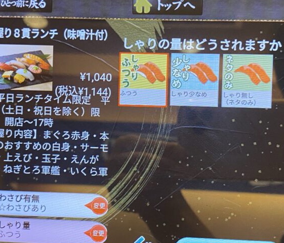 私はランチの握り8貫ランチを選択、しゃりの量を質問されますが…