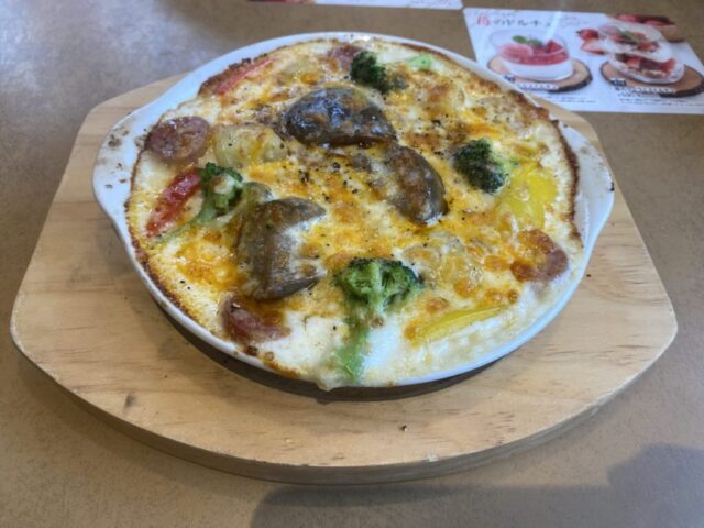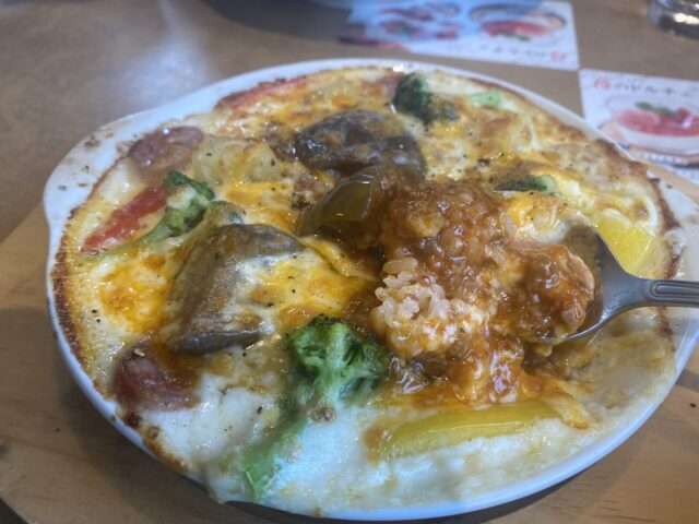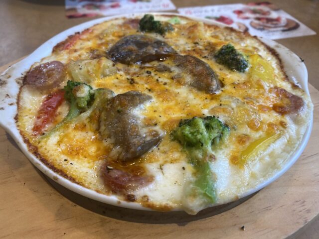 アップして見ると、よりチーズのかかりっぷりがわかりますね!お皿のふちの焦げ目がなんとも美味そうじゃないですかッ!