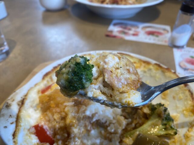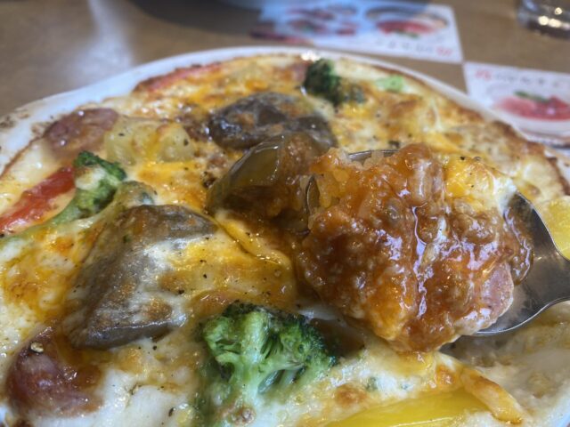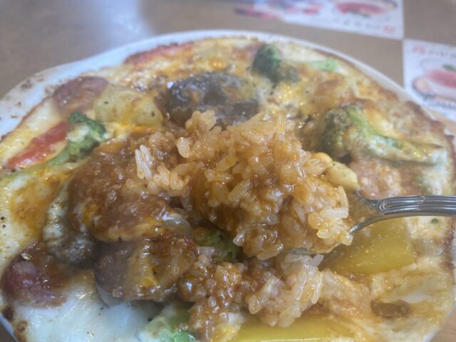 アツアツのアッツアツなので、チーズの下に隠れているライスを表に出して少し冷ましたほうが良さそうです。それでもアッツィィ!スプーンですくって、ふーふーして冷ましながら頬張ります。